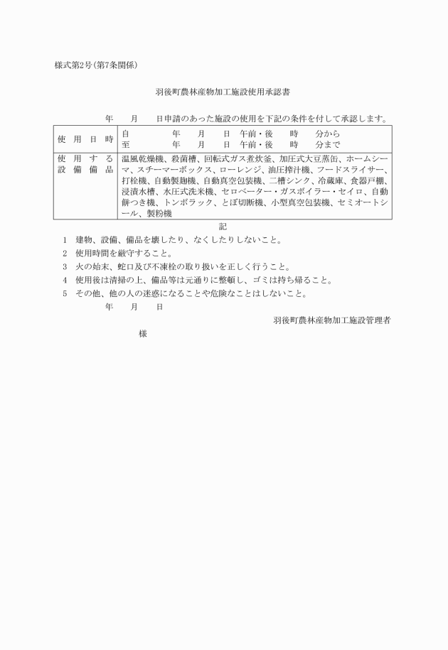 第五条 加工施設を使用しようとする者は、あらかじめ使用申請書(様式第一号)を提出し、加工施設管理者(以下「管理者」という。)の承認を受けなければならない。